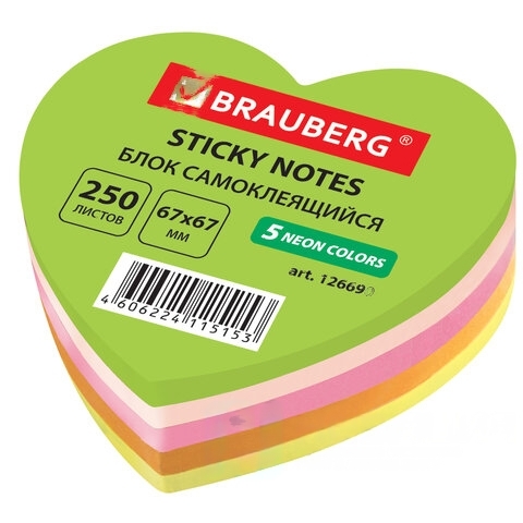 Блок самоклеящийся (стикеры), фигурный, BRAUBERG, НЕОНОВЫЙ "Сердце", 250 листов, 5 цветов, 126690