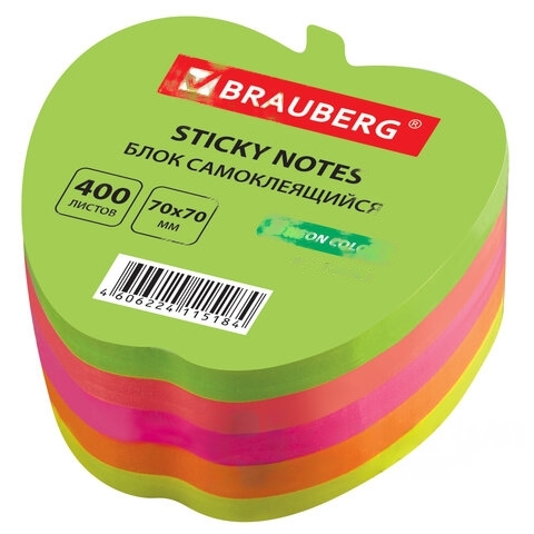 Блок самоклеящийся (стикеры), фигурный, BRAUBERG, НЕОНОВЫЙ "Яблоко", 400 листов, 5 цветов, 126693