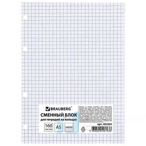 Сменный блок к тетради на кольцах, А5, 160 л., BRAUBERG, "Белый", 403261