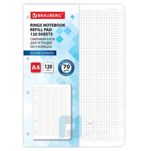 Сменный блок к тетради на кольцах БОЛЬШОЙ ФОРМАТ А4 120 л., BRAUBERG, ПОВЫШЕННОЙ ПЛОТНОСТИ, белый, 404516