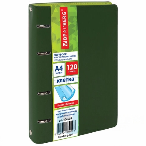 Тетрадь на кольцах БОЛЬШАЯ, А4 (240х310 мм), 120 л., под кожу, BRAUBERG "Joy", зеленый, 404508