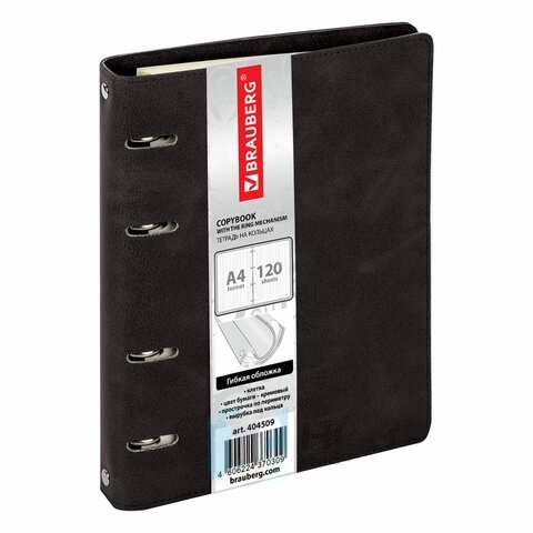 Тетрадь на кольцах БОЛЬШАЯ, А4 (240х310 мм), 120 л., под кожу, клетка, BRAUBERG "Main", черный, 404509