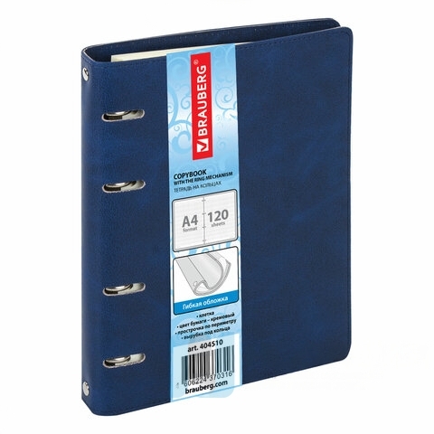 Тетрадь на кольцах БОЛЬШАЯ, А4 (240х310 мм), 120 л., под кожу, клетка, BRAUBERG "Main", синий, 404510