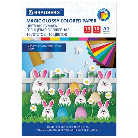 Цветная бумага А4 мелованная (глянцевая), ВОЛШЕБНАЯ, 10 листов 10 цветов, на скобе, BRAUBERG, 200х275 мм, "Зайчата", 129926