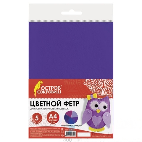 Цветной фетр для творчества, А4, ОСТРОВ СОКРОВИЩ, 5 листов, 5 цветов, толщина 2 мм, оттенки фиолетового, 660645
