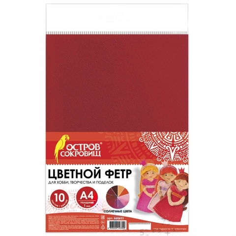 Цветной фетр для творчества, А4, ОСТРОВ СОКРОВИЩ, 10 листов, 10 цветов, толщина 1 мм, "Солнечный", 660653