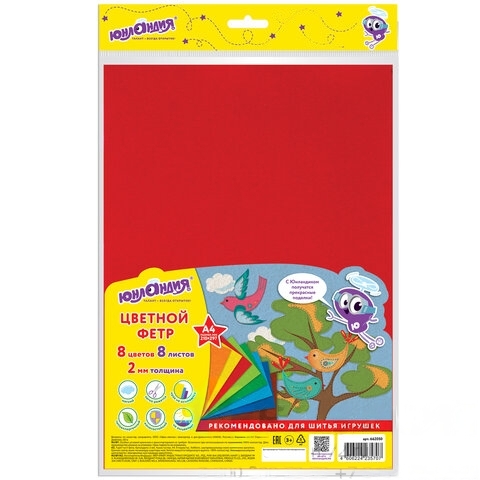 Цветной фетр для творчества А4 ЮНЛАНДИЯ 8 ЯРКИХ ЦВЕТОВ, толщина 2 мм, с европодвесом, 662050
