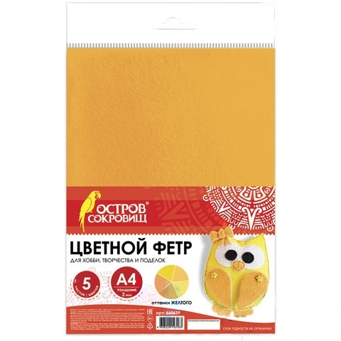 Цветной фетр для творчества, А4, ОСТРОВ СОКРОВИЩ, 5 листов, 5 цветов, толщина 2 мм, оттенки желтого, 660639