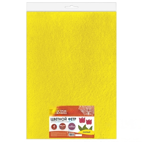 Цветной фетр для творчества, 400х600 мм, ОСТРОВ СОКРОВИЩ/BRAUBERG, 3 листа, толщина 4 мм, плотный, желтый, 660660