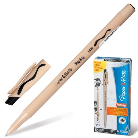 Ручка стираемая шариковая PAPER MATE "Replay", ЧЕРНАЯ, корпус бежевый, узел 1,2 мм, линия письма 1 мм, S0190784