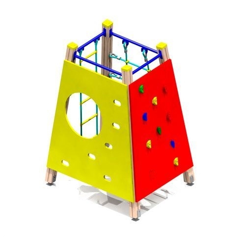 Альпинистские стенки выполнены из влагостойкой фанеры 21 мм. Гибкая лестница изготовлена из армированного полипропиленового каната с пластиковыми ступеньками. Вертикальная сетка – из полипропиленового армированного каната D 16 мм. Соединения ячеек сетки закрыты пластиковыми заглушками.