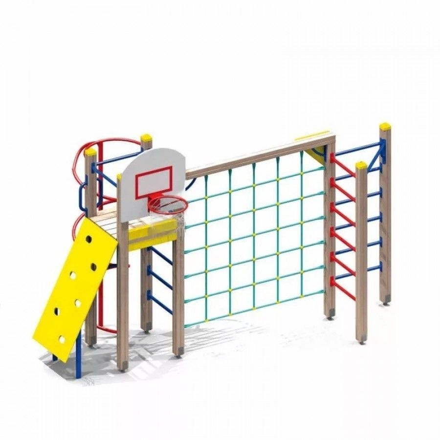 Несущие столбы изготовлены из клееного бруса, сечением 100х100 мм. Перекладины и поручни комплекса выполнены из труб, d 33 мм.
