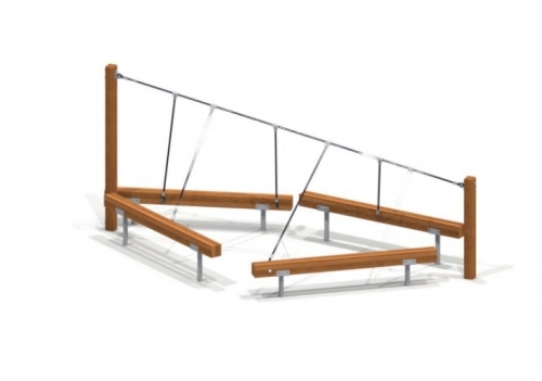 Уличная композиция из 4-х бревен и 2-х опорных столбов займет площадь 7200х5170 мм. Брусья и стойки соединяются тросами с металлическими креплениями. Горизонтальные элементы оснащены 2-мя ножками. Служат полосой препятствий и тренажером для вестибулярного аппарата.