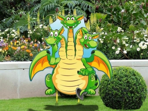 На фигуру нанесено цветное изображение Змея Горыныча, которое покрыто защитной пленкой. Устанавливается в землю при помощи металлических стоек и крепежа (входят в комплект).