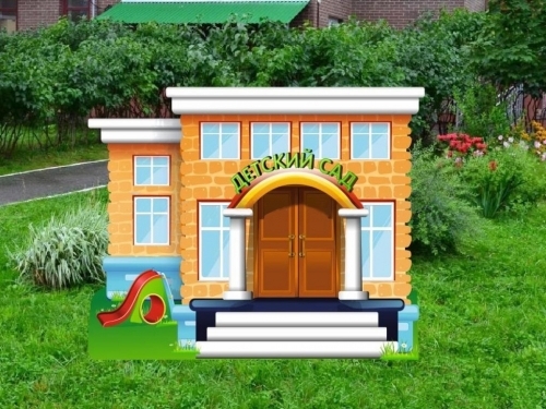 Фигура с цветным изображением изготовлена в виде здания детского сада. На поверхность нанесена пленка для защиты от воздействия внешней среды. Устанавливается посредством металлических стоек и крепежа (входят в комплект).