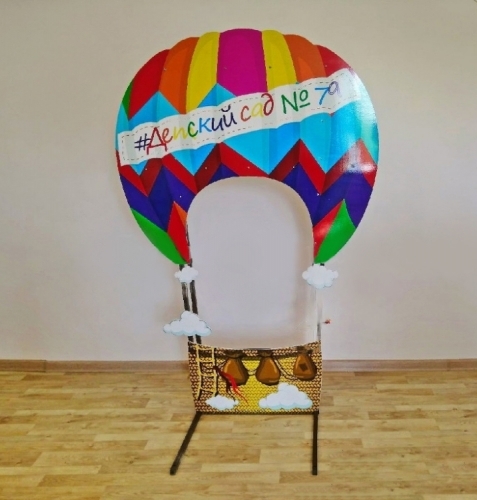 Стенд в виде воздушного шара с отверстием для лица размещается на металлокаркасе с 2-мя опорами. Конструкция предназначена для фотосъемки.