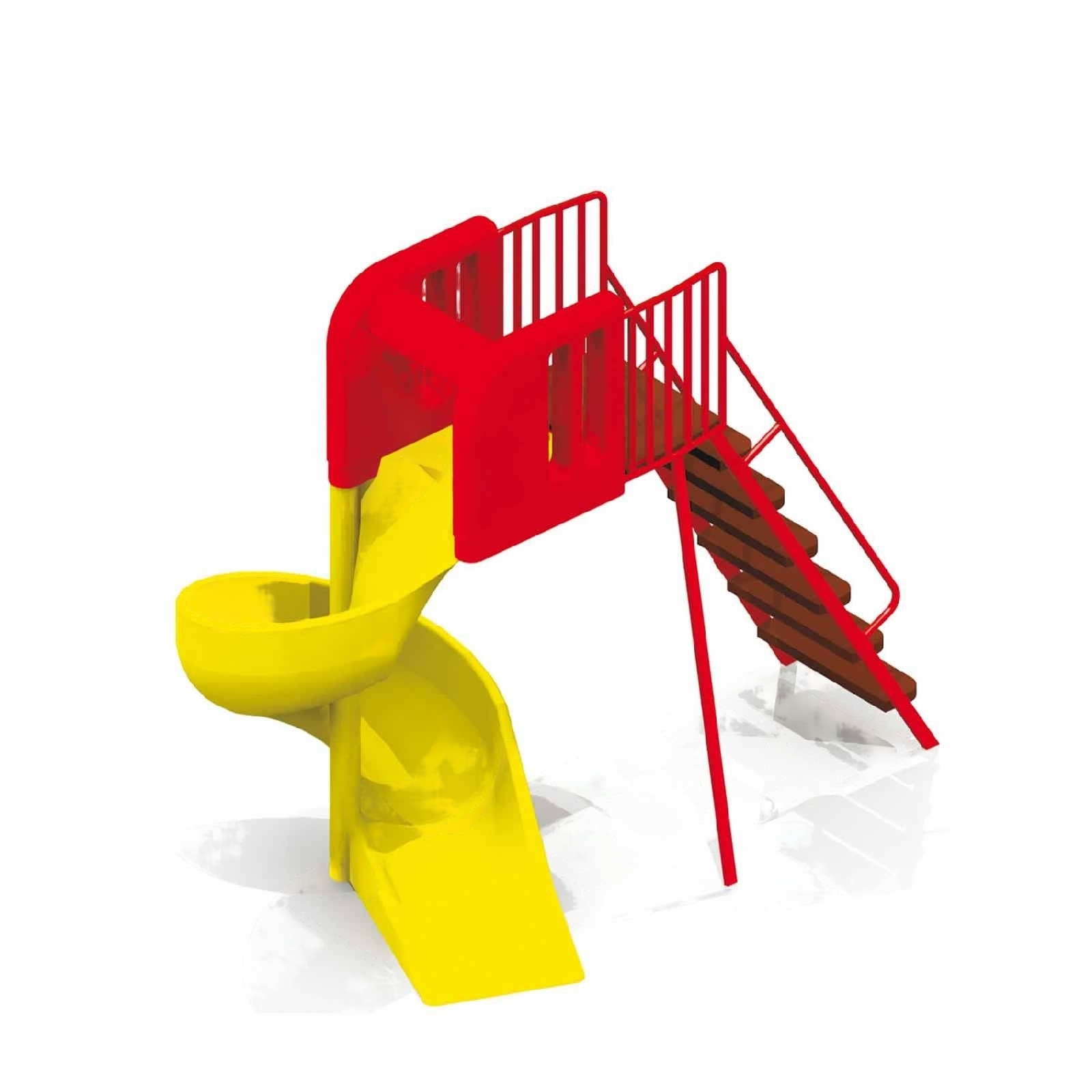 Площадка закрепляется на высоте 1800 мм. Нескользящий пол изготавливается из фанеры. Лестница с влагостойкими ступенями окружается поручнями. Металлические ограждения площадки переходят в пластиковые защитные экраны с поперечной перекладиной наверху. Прочный спиральный скат составляется из пластиковых сегментов.