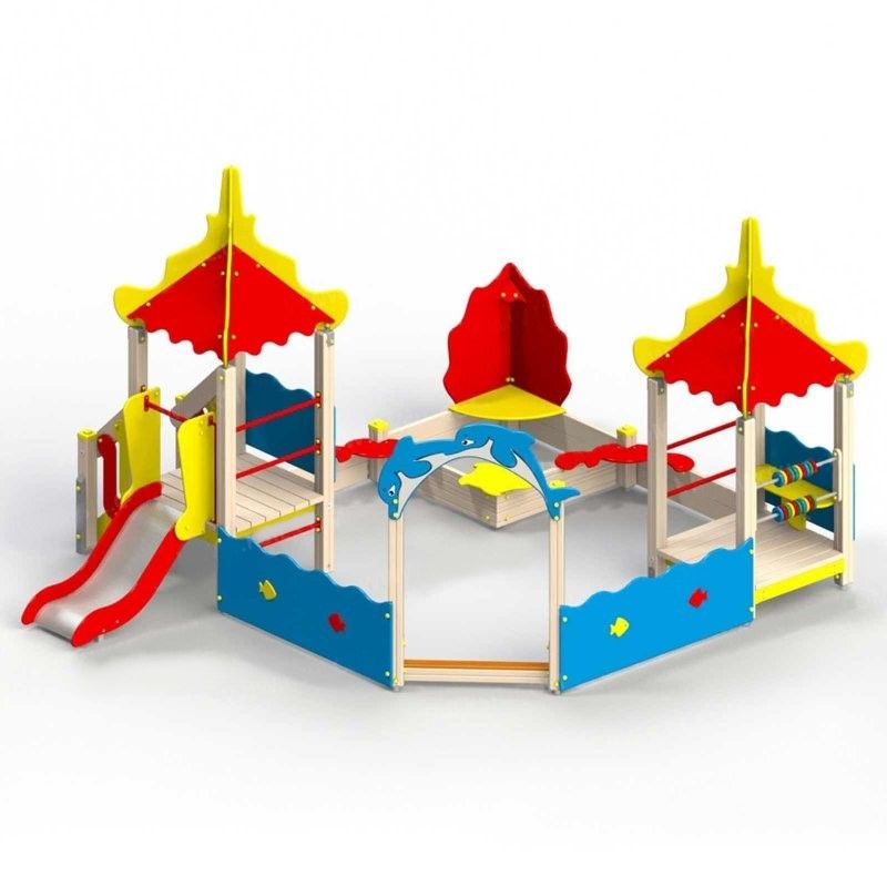 Несущие столбы и нескользящий порог изготавливаются из клееного бруса. Вход оформляется фанерной аркой 2-х дельфинов. Площадка украшается декором в морском стиле: панели с волнообразными краями дополняются изображениями рыбок. Полы в башнях выполнены из деревянных досок. Крыши с резными краями изготавливаются из влагостойкой фанеры. К горке ведет лестница с перилами. Нержавеющий скат горки окружается фанерными бортиками. Стартовый участок дополнен перекладиной и защитными экранами. Счеты представлены пластиковыми или деревянными крутящимися элементами на металлических перекладинах. Песочница составляется из бортиков, угловых сидений, фигурных боковых панелей.