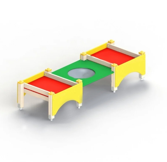 Опорные столбы выполняются из клееного бруса, емкость пластиковая, бортики из деревянных досок, остальные элементы влагостойкие фанерные. Стол с отверстием и округлой емкостью для песка размещается по центру конструкции. Боковые стенки песочниц имеют дугообразную нижнюю грань.