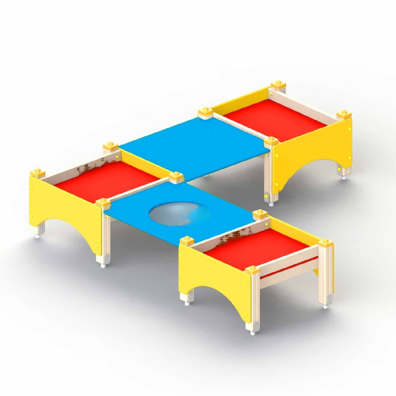 Опорные столбы выполняются из клееного бруса, емкость пластиковая. Бортики песочниц изготавливаются из деревянных досок, остальные элементы влагостойкие фанерные. Одна столешница оснащается отверстием и округлой емкостью для песка, вторая представлена плоской рабочей поверхностью. Боковые стенки песочниц имеют дугообразную нижнюю грань.
