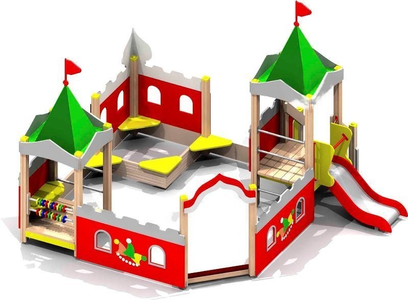 Огороженная площадка включает в себя: несущие столбы, боковые стенки, порог, арку, 2 башни с куполами, песочницу, горку и лестницу, декоративные элементы.
