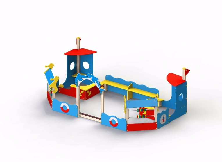 Огороженная площадка включает в себя: несущие столбы, боковые стенки, порог, арку, 2 скамейки, 2 песочницы, панели с прорезями-иллюминаторами, декоративные элементы в виде морских коньков, спасательных кругов, флагов.