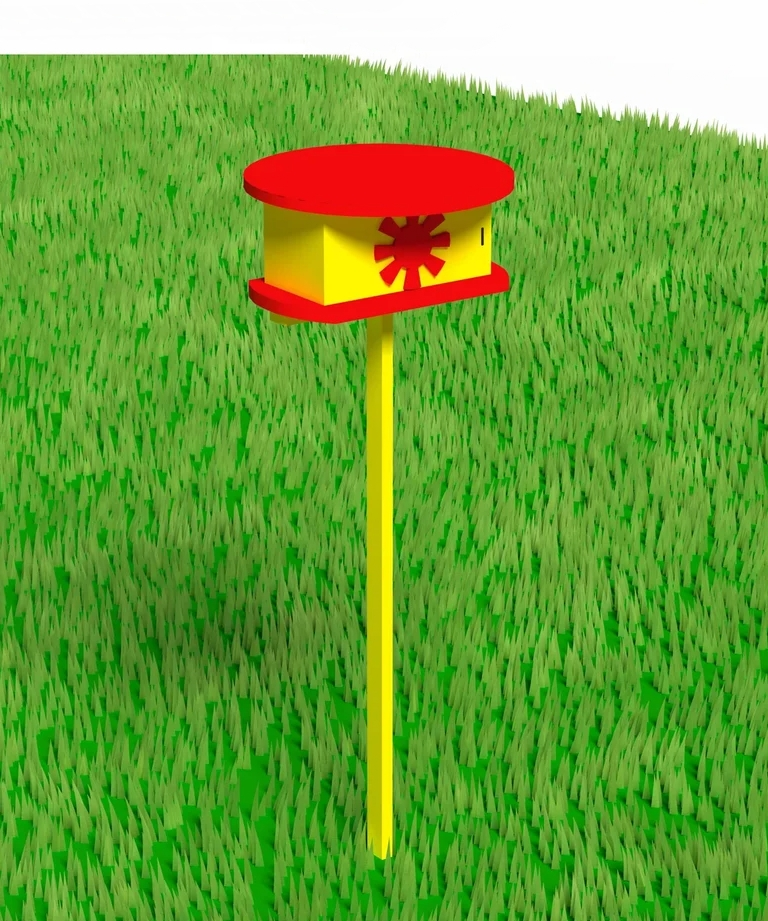 Элемент детской метеоплощадки размещается на улице. Это установка в виде домика со встроенным проигрывателем. Конструкция крепится к стойке, воспроизводит звуки природных явлений. Домик дополнен круглой полкой.