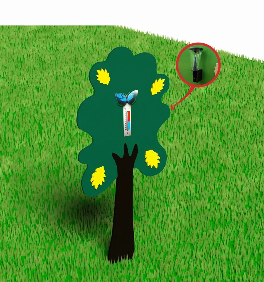 2-хсторонний комплекс для метеоплощадки представлен панелью в форме дерева. Дополнительные элементы позволяют определять температуру и количество осадков. С одной стороны закреплена емкость, со второй-термометр.