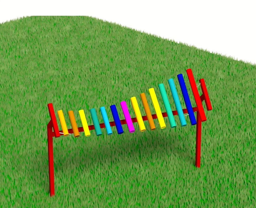Установка для музыкальной площадки помогает развить слух. Горизонтальный ряд из полых трубок закрепляется на металлокаркасе. Конструкция с 2-мя опорами укреплена перекладиной. Полые трубки различаются по цвету и звучанию. Каждой соответствует отдельная нота. Можно стучать по элементам рукой, палочкой или другим предметом. Ребенок сравнивает звуки и запоминает цвета.