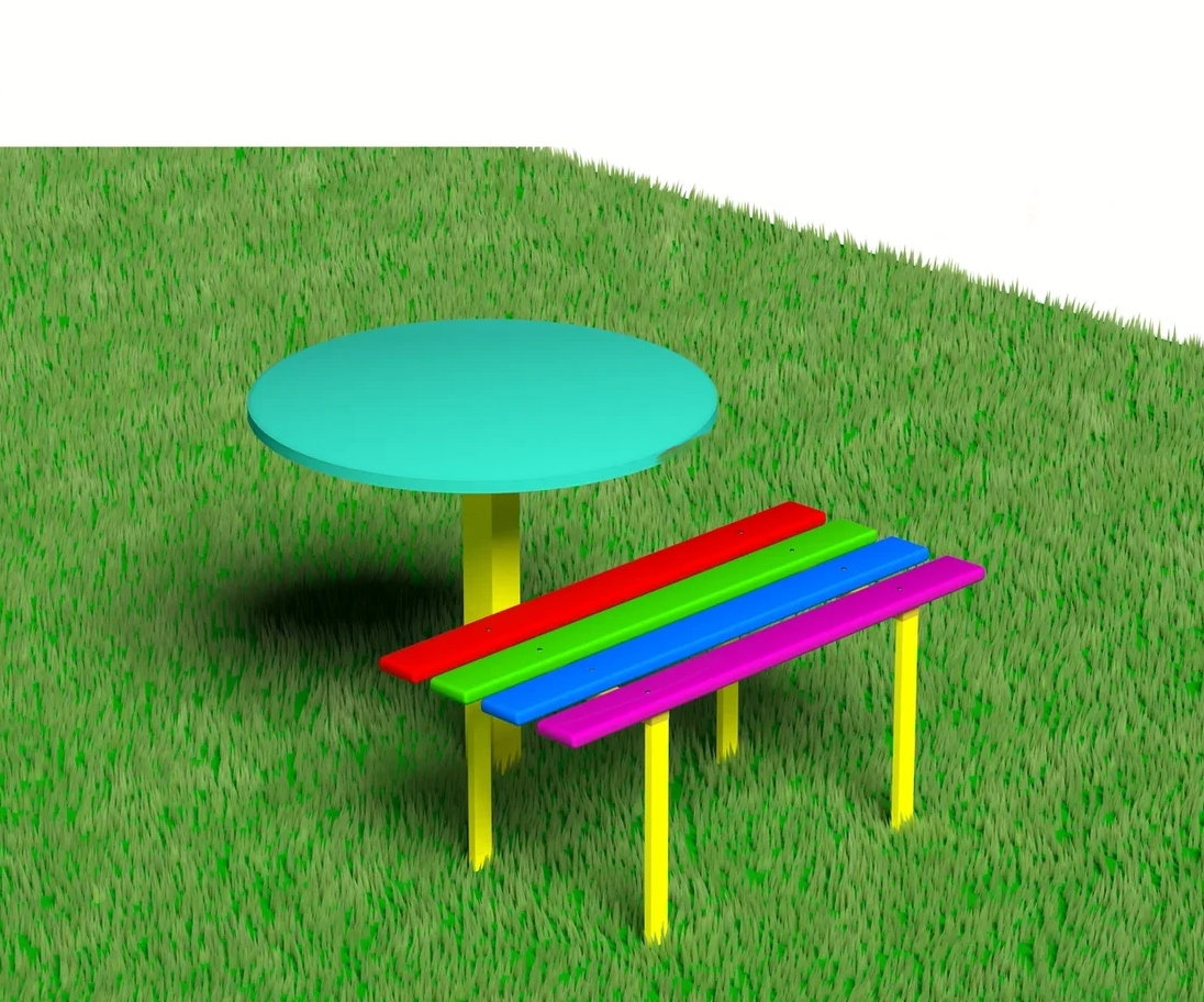 Оборудование для отдыха размещается в уличных игровых комплексах, например, на музыкальной площадке. Скамейка и столик могут использоваться во время творческих занятий. Прямоугольное сиденье из разноцветных реек опирается на 4 ножки. Круглая столешница закреплена на стойке. Металлические трубы покрыты гипоаллергенной краской.