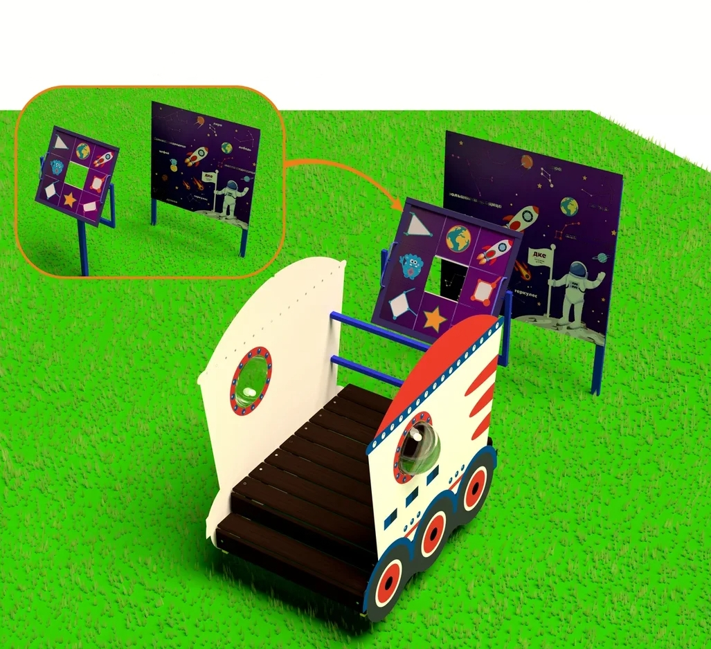 - 2 стенда на металлических опорах украшены изображениями ракет, планет, звездочек, космонавта. Стенд с квадратным окошком по центру задействуется в играх на внимательность, помогает проверить зрение;