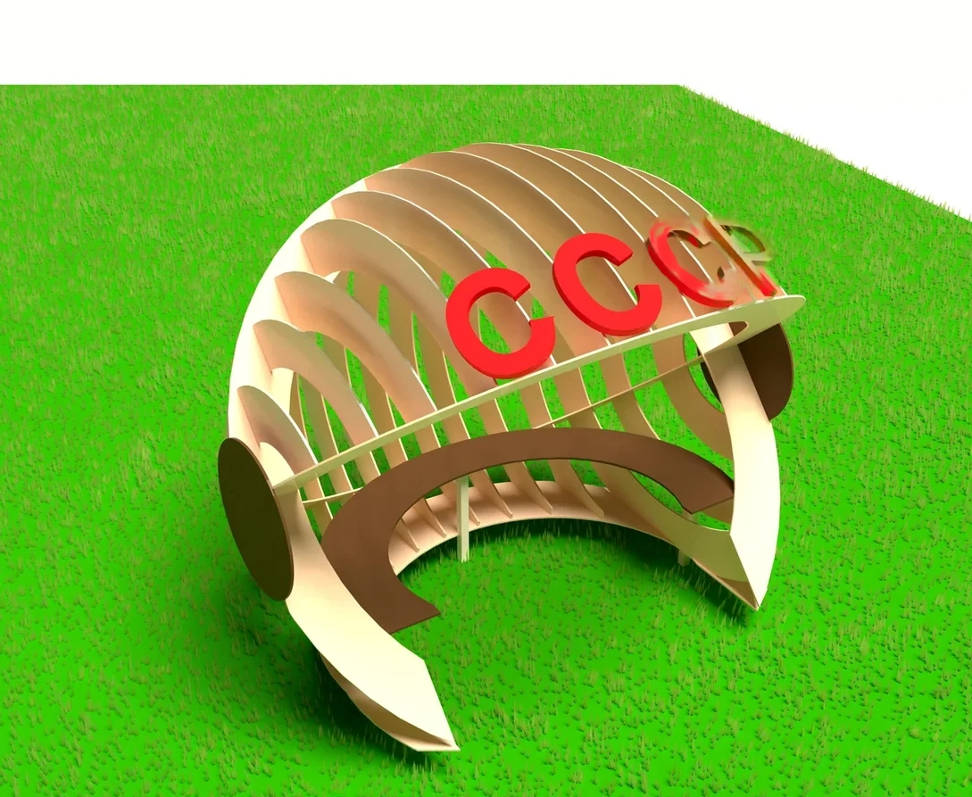 Теневой навес для космической площадки оснащен полукруглой скамейкой. Веранда служит зоной отдыха, защищает от ветра и прямых солнечных лучей. Корпус в форме шлема украшен резными буквами.