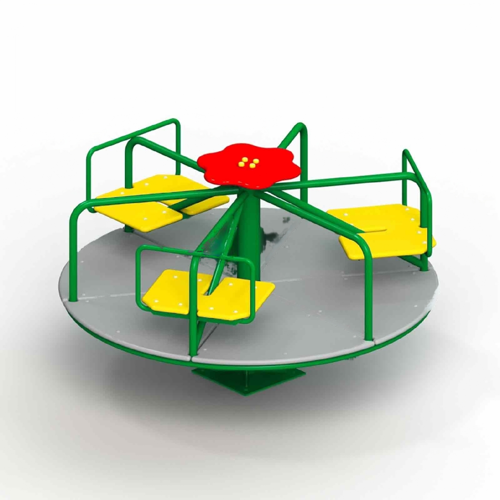 Конструкция включает в себя: центральную ось, опору, каркас, платформу, 3 сиденья со спинками, руль, поручни.