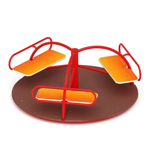 Каркас карусели выполнен из металлических труб, покрытых порошковой краской. Пол и сиденья, размером 760х300 мм, изготовлены из влагостойкой ламинированной фанеры. Площадка для установки должна быть в диаметре не менее 5620 мм.