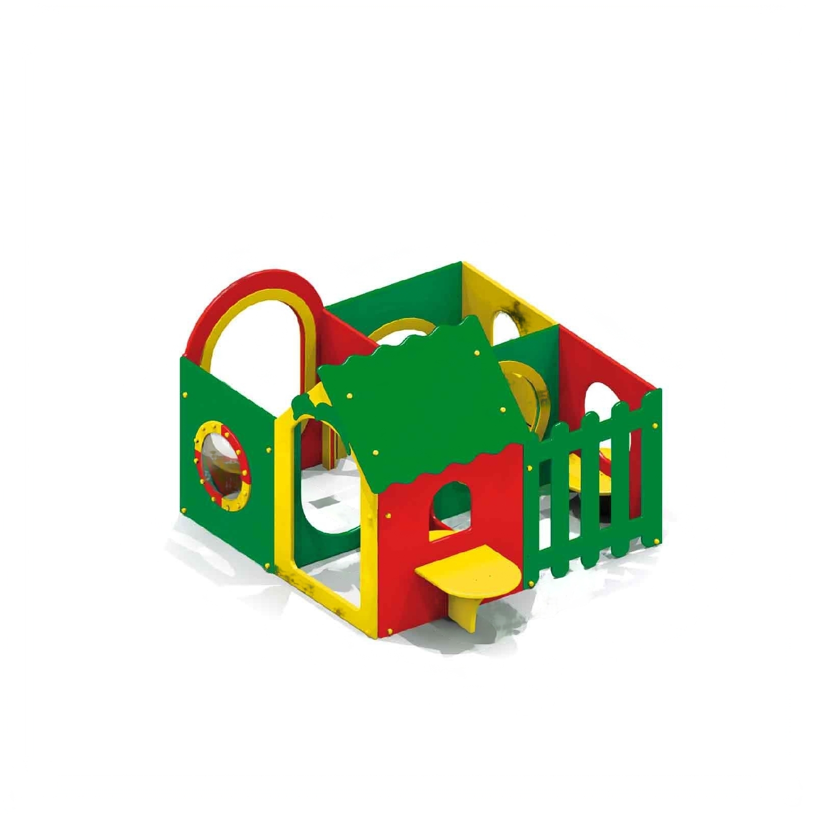 Игровой домик из 4-х квадратных секций оснащен переходами: арками, лазами круглой и овальной формы. Ограждения лабиринта выполнены в виде заборчика. Есть прозрачный иллюминатор, 1-скатная крыша с волнообразным нижним краем, столики и сиденья. Панели скрепляются оцинкованными уголками.