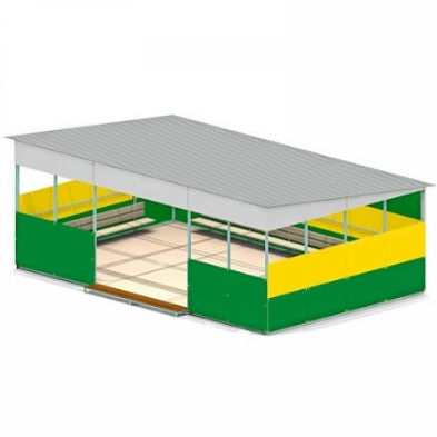 Пол изготавливается из деревянной доски. Стены в комплексе фанерные влагостойкие. Наклонная 1-скатная крыша оформляется из профильного листа, фронтоны фанерные. Каркас составляется из металлических труб. Вдоль стен устанавливаются скамейки со спинками. Фанерный порог не скользит.