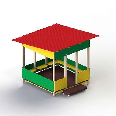 Теневой навес для отдыха оснащен одним входом. Порог и пол покрыты противоскользящей фанерой. Вдоль 4-х стен с панелями и опорными столбами закрепляются скамейки. Рельефный скат, установленный под наклоном, защищает конструкцию от солнца и осадков.