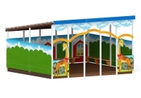Веранда с односкатной крышей размещается на опорах, которые устанавливаются в фундамент. В целях безопасности на полы нанесено антискользящее покрытие. Фасад украшен фигурами жирафов и декоративным карнизом в виде облаков.
