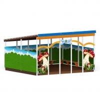 Фасад веранды украшен декоративными элементами в виде грибов, травы, улитки, бабочки. Каркас конструкции выполнен из профильных труб 80х80 мм. Веранда оснащена односкатной крышей для защиты от осадков. Внутри беседки размещены скамьи.