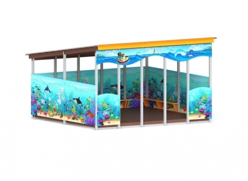 Ограждения веранды украшены иллюстрациями на морскую тематику. Конструкция размещается на опорах прямоугольной формы. Оснащена односкатной крышей. Внутри беседки размещены скамьи.