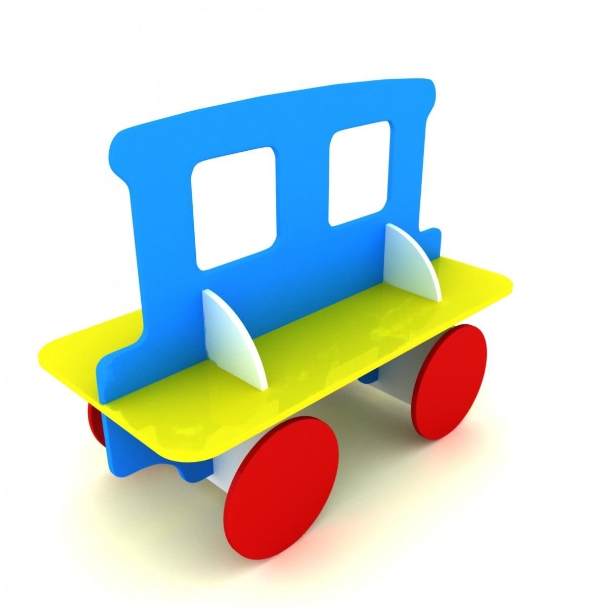 2-хсторонняя скамейка выполнена в форме вагона. Углы сиденья закруглены, по центру проходит фигурная перегородка с 2-мя прорезями-окошками, которая служит спинкой. Опоры конструкции дополнены 4-мя накладками в виде колес.