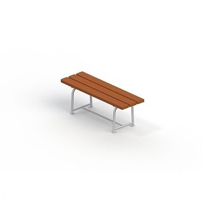 Прямоугольное сиденье из деревянных досок закрепляется на металлическом каркасе. 4 ножки представлены трубами круглого сечения, которые соединяются попарно и укрепляются продольной перекладиной.