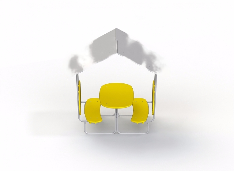 Конструкция включает в себя: металлический каркас, 2 скамьи, столик, навес.