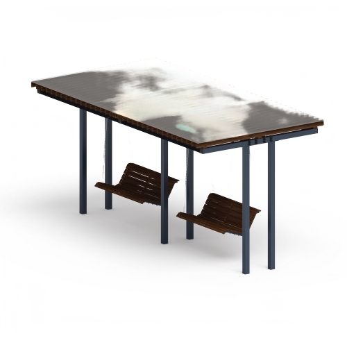 Прямой тент с поликарбонатным навесом и 2-мя качелями рассчитан на 4-х человек. Размещается на 6-ти круглых опорах. Покрытие крепится к конструкции при помощи саморезов. Стойки, балки и перекладины соединяются между собой болтовым креплением.