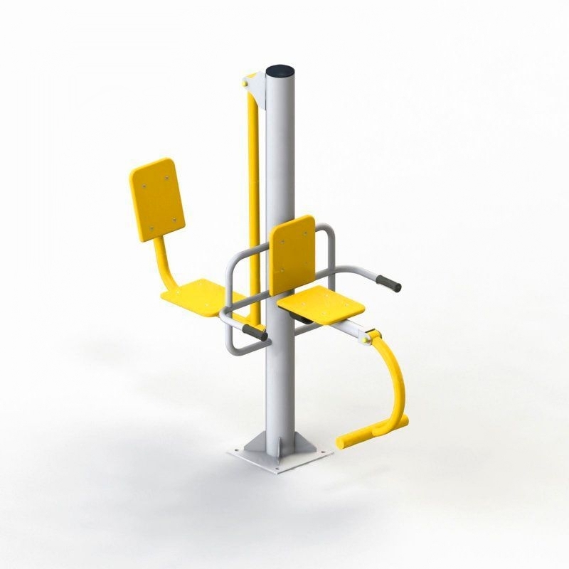 Второе посадочное место соединено со стойкой тяжем. Данная часть тренажера предназначена для тренировки мышц ног при отжимании от упоров. При выполнении упражнений сиденье сдвигается и приближается к стойке. Конструкция оснащена поручнями.Спинка и сидение тренажера изготовлены из влагостойкой фанеры. Рукоятки из металла покрыты резиной для удобства хвата.