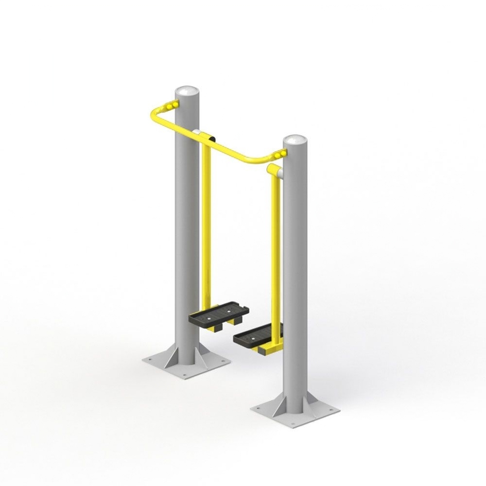 Несущие стойки из металла фиксируются на плитах с креплениями к фундаменту. Между стойками сверху закрепляется металлический поручень. Со внутренней стороны к стойкам присоединяются верхние концы труб, которые раскачиваются из стороны в сторону. Внизу каждая труба дополняется морозостойкими пластиковыми площадками. Школьник встает на опорные площадки для ног и двигается, держась за поручень.