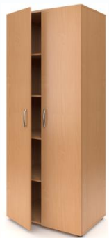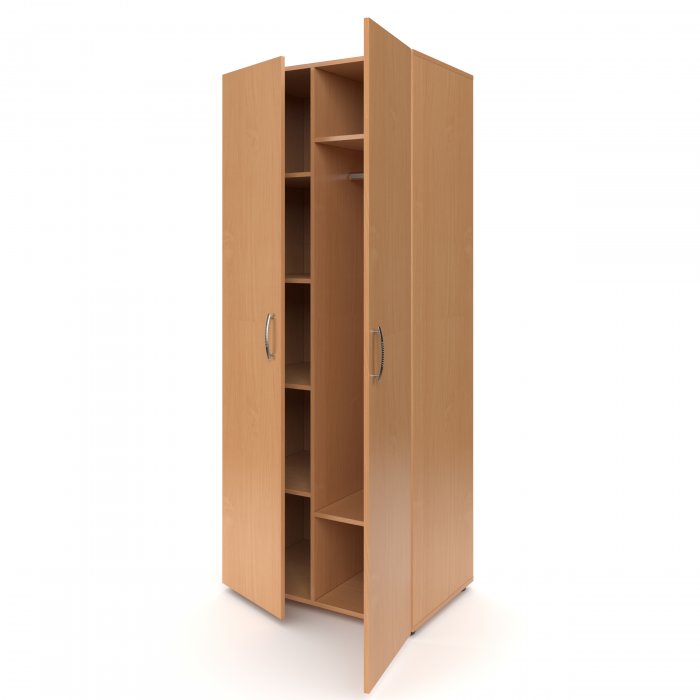 Шкаф выполнен из ЛДСП 16мм и устанавливается на регулируемые опоры. Торцы фасадов закрыты противоударной кромкой ПВХ толщиной 2мм. Фасады оснащены металлическими ручками. Шкаф имеет два отделения. Левое отделение имеет 4 полки. Правое отделение имеет полку для головных уборов, полку для обуви и металлическую перекладину для плечиков.
