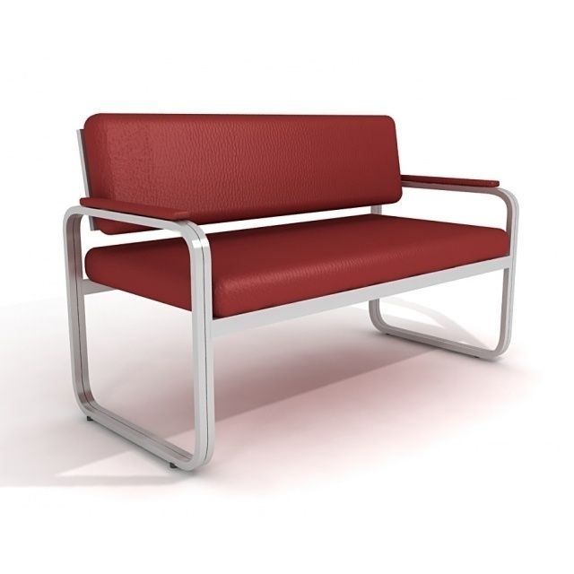 Диван подходит для медицинского кабинета или зоны ожидания. Изделие стоит на боковых опорах из труб прямоугольного сечения, парно соединенных с подлокотниками и укрепленных перекладиной. Мягкие прямоугольные элементы сиденья и спинки разделены. Опоры скамейки дополняются подпятниками. На подлокотниках предусматриваются фрагменты с обивкой.