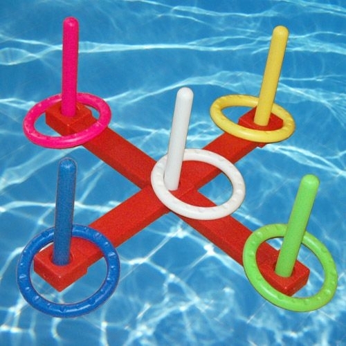 Кольцеброс подходит для игр в детском бассейне. Крестообразная опора удерживается на поверхности воды. По краям каждого луча и в центре устанавливаются разноцветные стойки. На каждую стойку забрасывается кольцо соответствующего цвета. Занятия с кольцебросом развивают меткость и вырабатывают способность к цветоразличению.