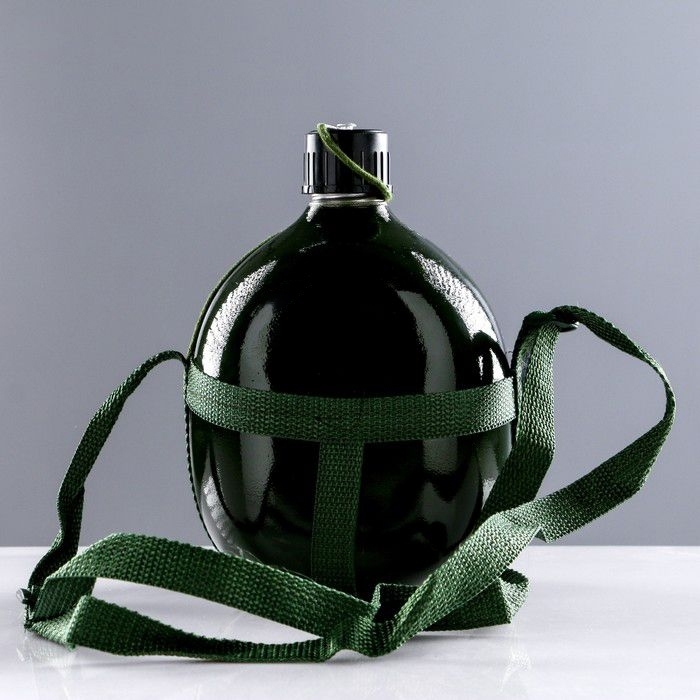 Походная фляга представляет собой легкую и вместительную емкость с ремнями и крышкой на шнурке.